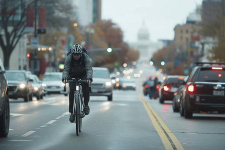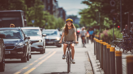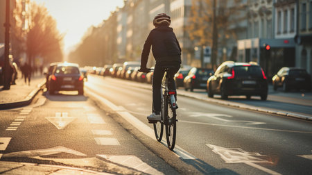 Cyclist on city bike lane, endorsing sustainable, healthy urban commuting.