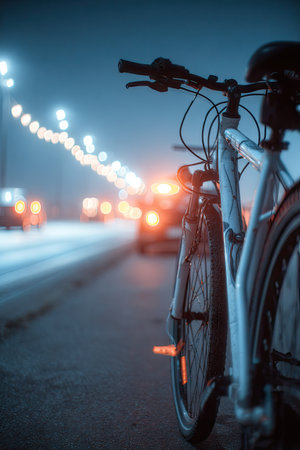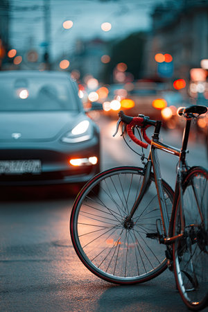 A bicycle is parked on a city street, partially obscuring the view of a car. The image showcases the vehicle's headlights and taillights. The background is filled with blurred city lights creating a vibrant atmosphere. This composition may be suitable for various editorial and commercial projects.