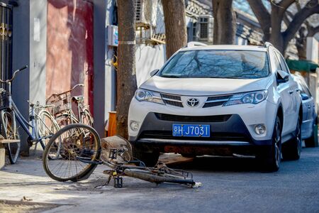 BEIJING, CHINA - MARCH 10, 2016: Bicycles, scooters and cars in Beijing streets. There are many different motorcycles and bicycles on the streets of the Beijing. With motorcycles transporting people, goods, building materials and much more.