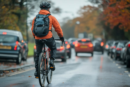 Person riding bicycle on wet road among cars in urban environment during fall season