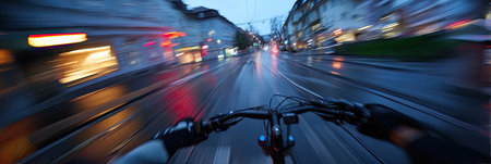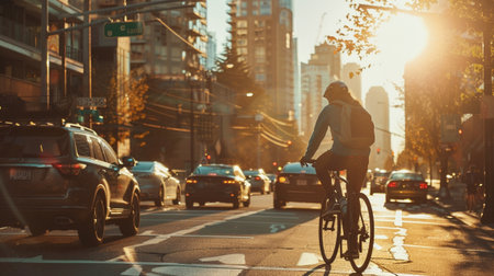 Healthy commuter cycling through city traffic at dusk for leisure generated by artificial intelligence
