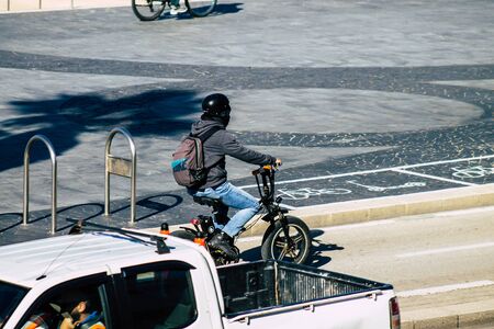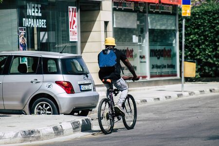 Limassol Cyprus May 21, 2020 View of unidentfied people rolling with a bicycle in the streets of Limassol in the afternoon