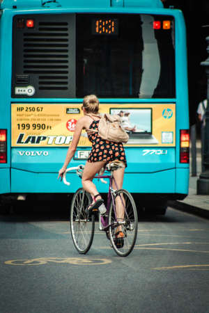 Budapest Hungary july 15, 2020 View of unidentified people rolling with a bicycle in the historical streets of Budapest, the capital of Hungary and the ninth largest city in the European Union