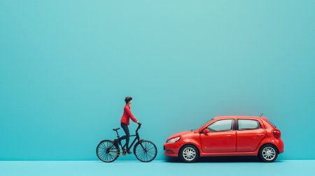 Scale model of Bicyclist interacts with a red car against a bright blue background