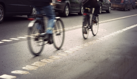 Cyclists in blurred motion in busy street on gloomy rainy day