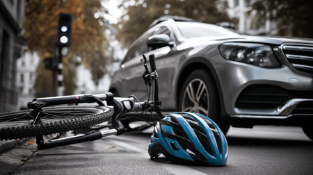 A striking image depicts a bicycle and blue helmet on the road after a serious accident with a sleek SUV, highlighting the chaos and urgency of urban life.