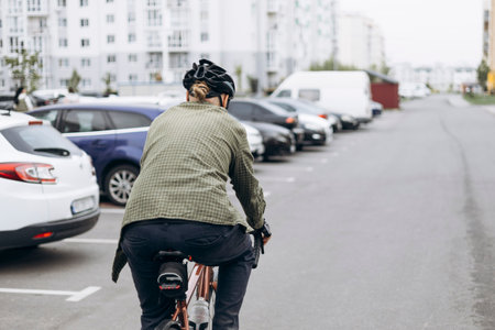 Young bearded man in helmet and casual clothes riding bicycle to work.