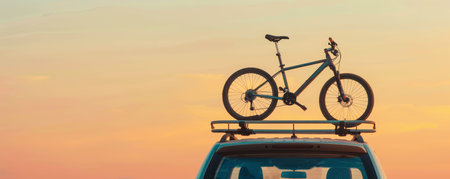 A bike secured on a car rooftop during a sunset, perfect for adventure and travel themes.