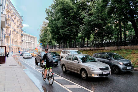 Moscow, Russia - Jul 2020: General landscape view at tradition Moscow architecture. City life on the main streets of the city. The citizens go on their own business. Automobile traffic.