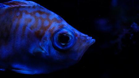 A close-up view presents a fish showcasing intricate scale patterns and textures. The fish resides within a marine environment featuring coral formations. Dark blue and teal hues dominate the color palette. This image may be utilized for educational resources or various design applications.