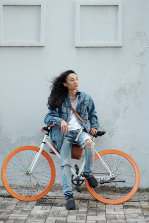 Serious handsome young Vietnamese model with long hair in wind sitting on bicycle with orange wheels and looking into distance