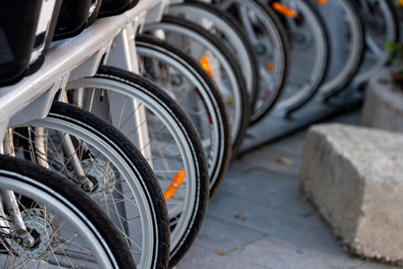 View with a shallow depth of field of modern rental electric bikes standing in two rows during charge and slightly overlapping with wheels outdoors on a bright day with a selective focus in the middle