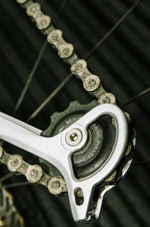 Wheel with a tread with a chain closeup. Bike, cardio workout