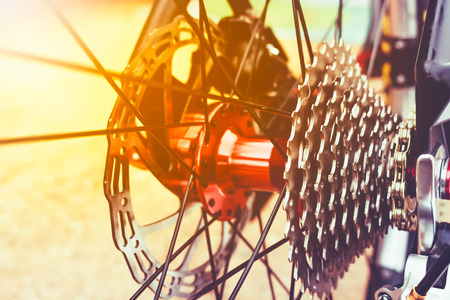 Closeup gear mountain bike wheel detail and disc brake with bright sunlight. Outdoor at the day time.