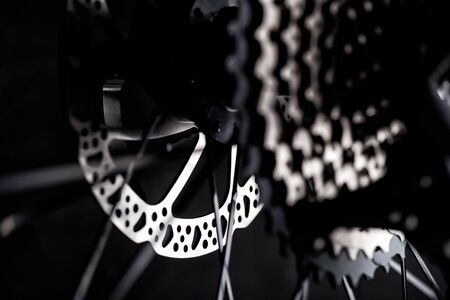 Close-up of wheel with chain and sprocket disc brake and posterior derailleur of modern mountain push-bike. Bicycle detailed view. Push-bicycle workshop concept
