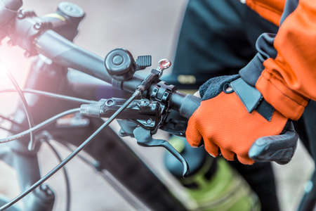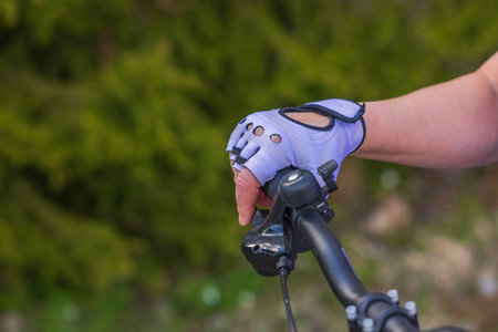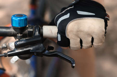 Close-up of cyclist hand wearing glove and holding a bicycle brake. Brake is use to reduces the speed of a bicycle from moving.