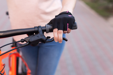 A girl in bicycle gloves holds her hand on the handlebars, clamping the brakes. A bicycle element on a street background.