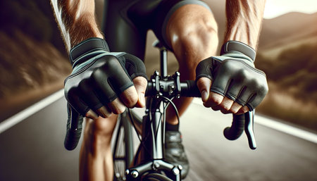 Hands in gloves holding road bicycle handlebar. Sports and outdoor activities concept.
