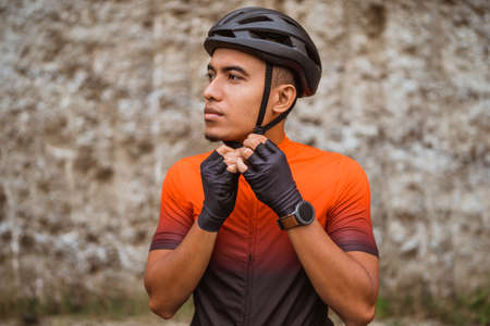 Young man cyclist wearing his sports helmet outdoor