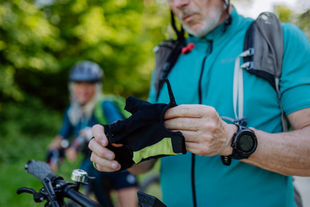 Close-up of senior man biker putting on bicycle gloves in nature.