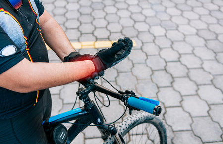 Cyclist man with hand pain outdoors. Close up of cyclist with arthritis outdoors