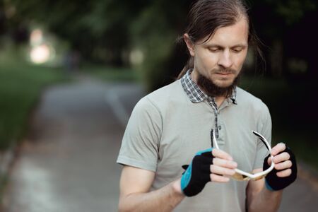 Close up Portrait cyclist putting on a glasses and adjusting. Green background.