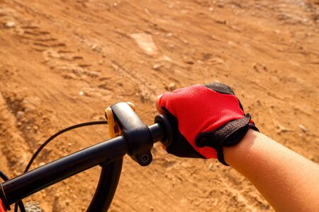 Fist of a boy with red cyclist gloves pedaling on a dirt track.