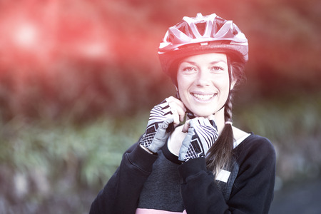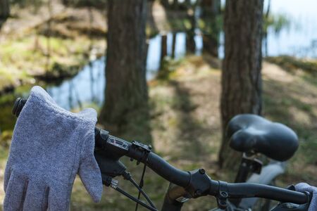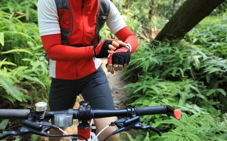 Woman wearing a gloves preparing for the bike ride in the park