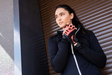 low angle view of beautiful young woman touching sport gloves and standing outside