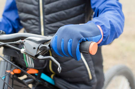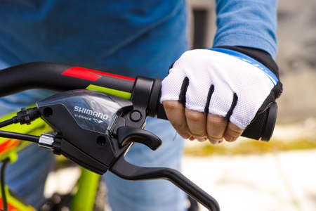 Tambov, Russian Federation - May 07, 2017 Child hand with glove on handlebars with Shimano speed shift and brake lever.