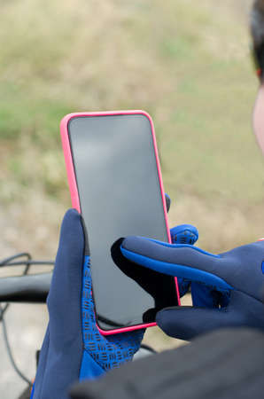 A cyclist in sports gloves touches the blank black display of a smartphone