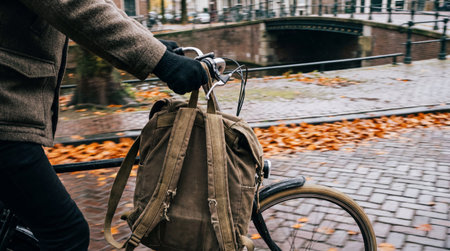 Man in brown wool coat and black gloves rides a bicycle along a cobblestone path. Worn brown canvas backpack hangs from handlebars. Fallen autumn leaves cover the ground.
