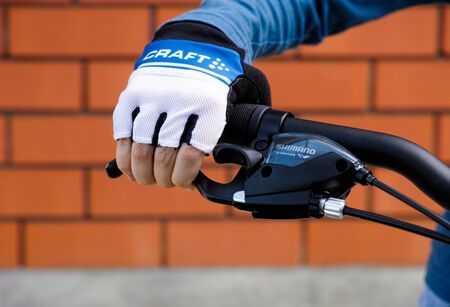 Tambov, Russian Federation - May 07, 2017 Child hand with Craft glove on handlebars with Shimano brake lever.