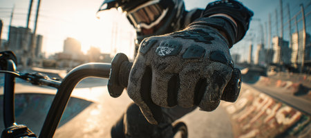 Photorealistic close-up of a BMX rider's gloved hand gripping the handlebars, capturing the tension and gear details, with an urban skatepark in the background.