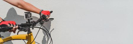 Banner the hands of a guy in red gloves on the handlebars of a bicycle with an action camera. On a light background