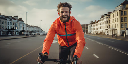 Smiling man in a vibrant orange jacket cycling on a city street, exuding joy and active urban living. A.I.