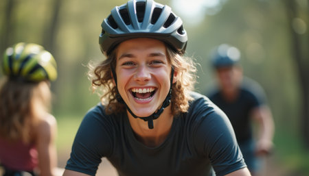 A lively group of cyclists glides along a sunlit path, creating a joyful atmosphere as they pedal toward the horizon. Their smiles radiate the thrill of outdoor adventure together.