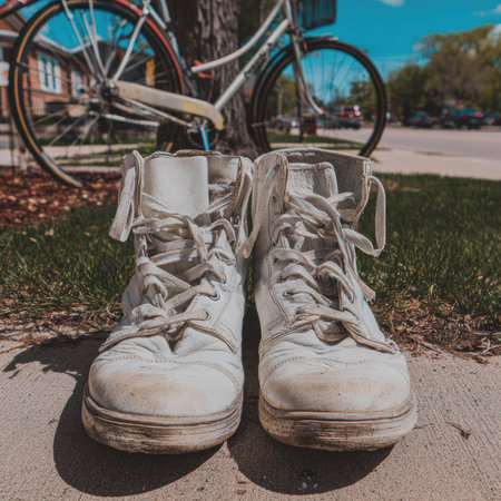 Worn white high-top sneakers stand on a sidewalk with a bicycle nearby.