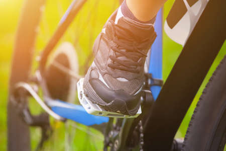 close up foot on pedal of bicycle , bicycle sport concept