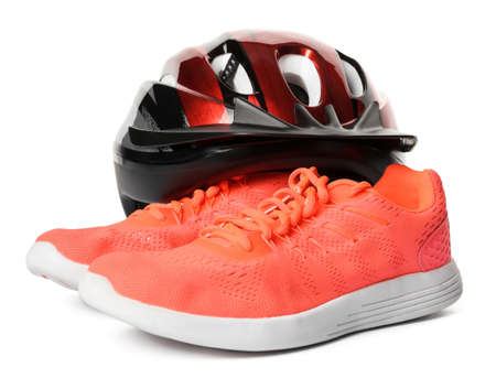 Sportive female shoes and helmet on white background