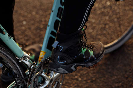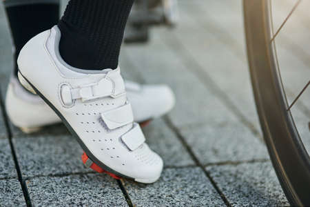 Close up bike shoes ready for cycling outdoors. Sports and outdoor activities concept.