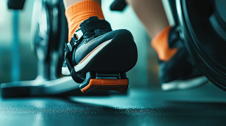 A dynamic close-up shot of a fitness shoe on a bicycle pedal during an intense indoor cycling session, showcasing the determination and energy of an active lifestyle.