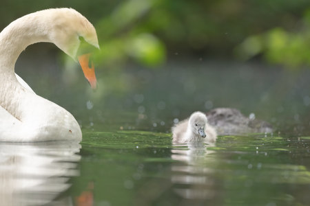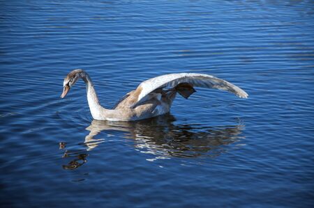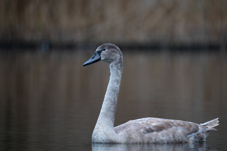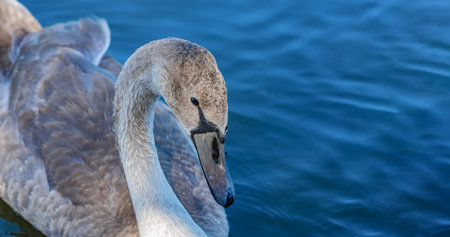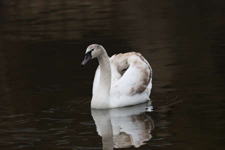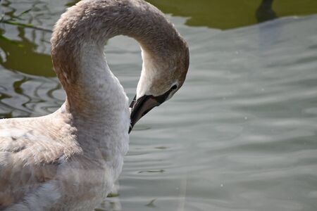 A young swan cleans feathers standing in the water, wildlife abstract background
