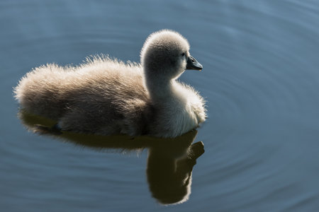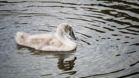 A baby swan with mottled plumage explores the shimmering water, its reflection distorting with each gentle ripple.
