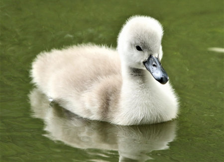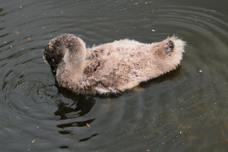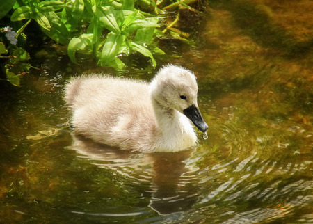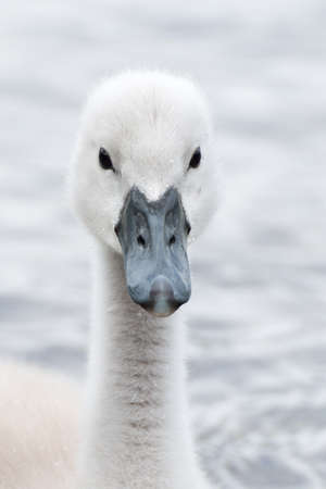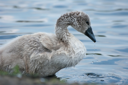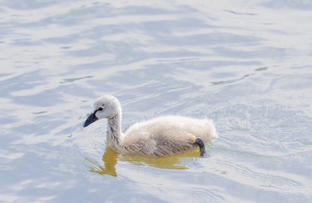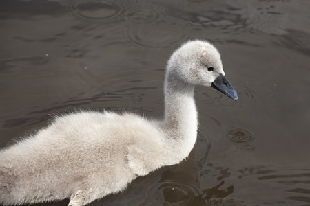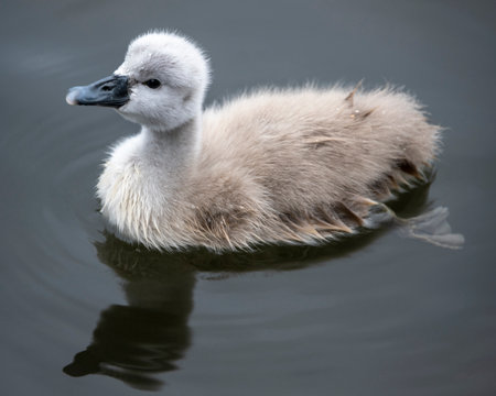 Baby swan or cygnet swimming in pond with water drops on feathers closeup