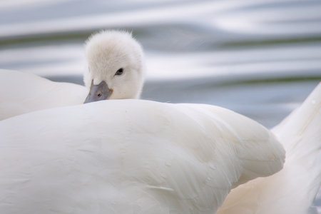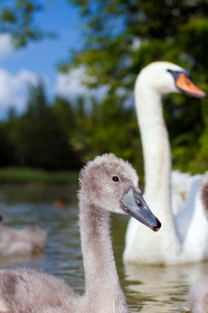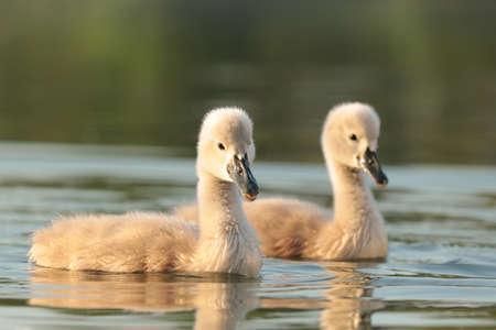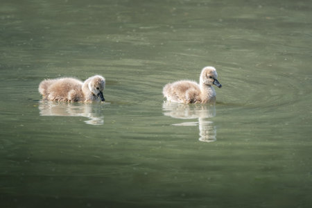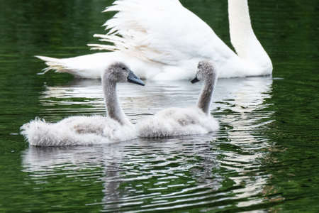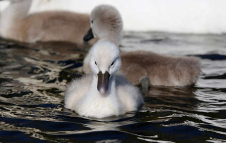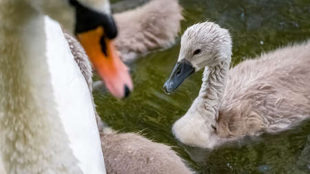 Close up of newborn mute swan (cygnus olor) cygnets swimming in the water