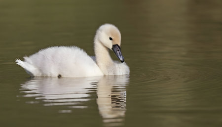 A young swan chick glides across the surface of a serene pond, surrounded by soft morning light and reflections, showcasing its fluffy feathers and curious demeanor.
