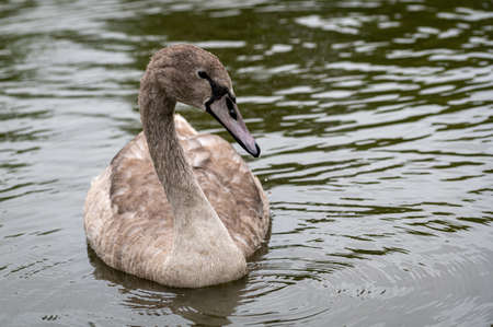 A young Mute swan (Cygnus olor) cygnet swimming on the surface of a pond.