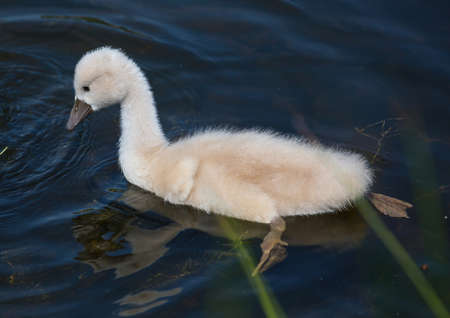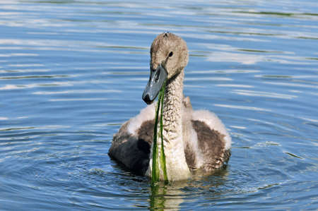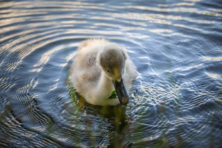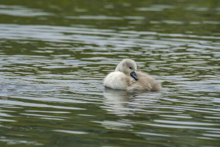 Single young mute swan (Cygnus olor) duckling on the water. Tired he fells asleep.