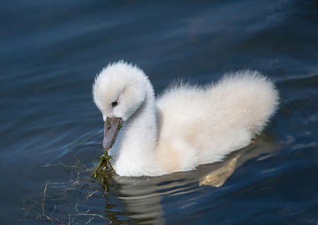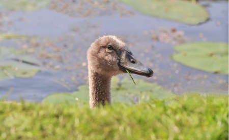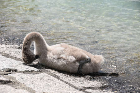 Cygnet or baby swan in detail on the shore of Lake Constance resting and pecking feather in summer time during sunny weather.